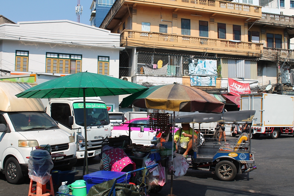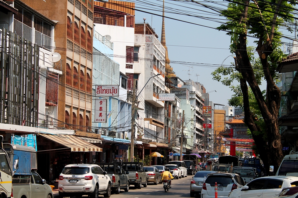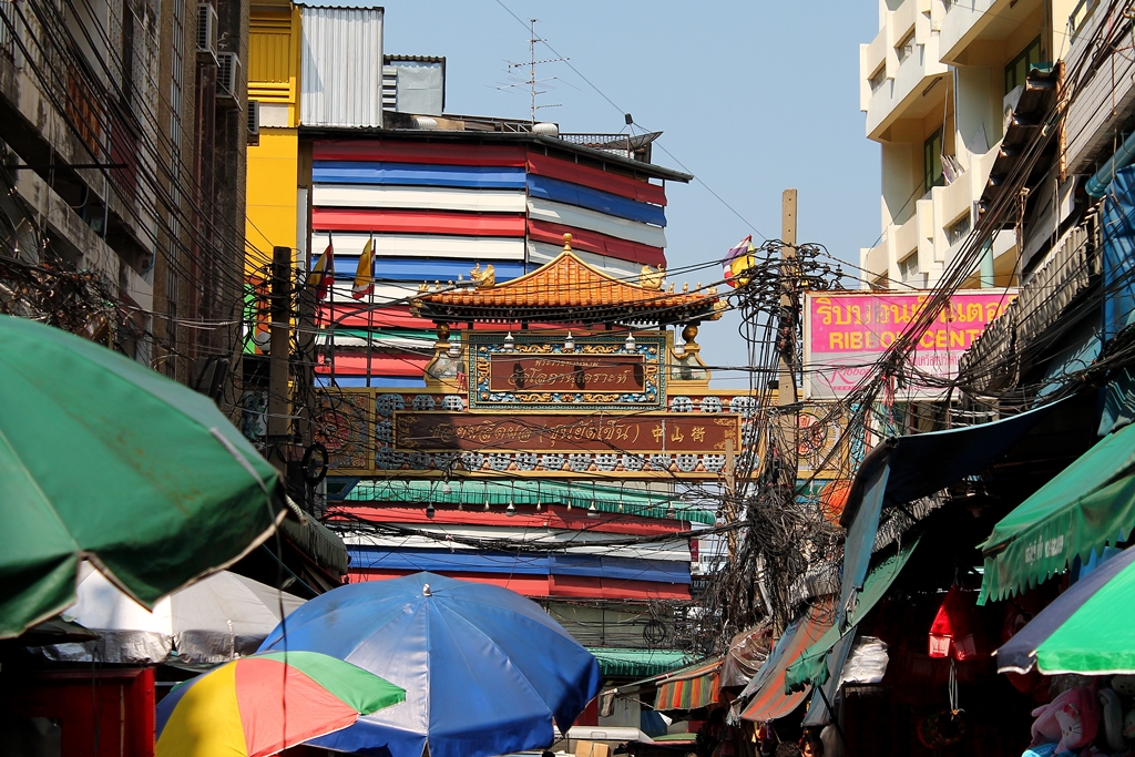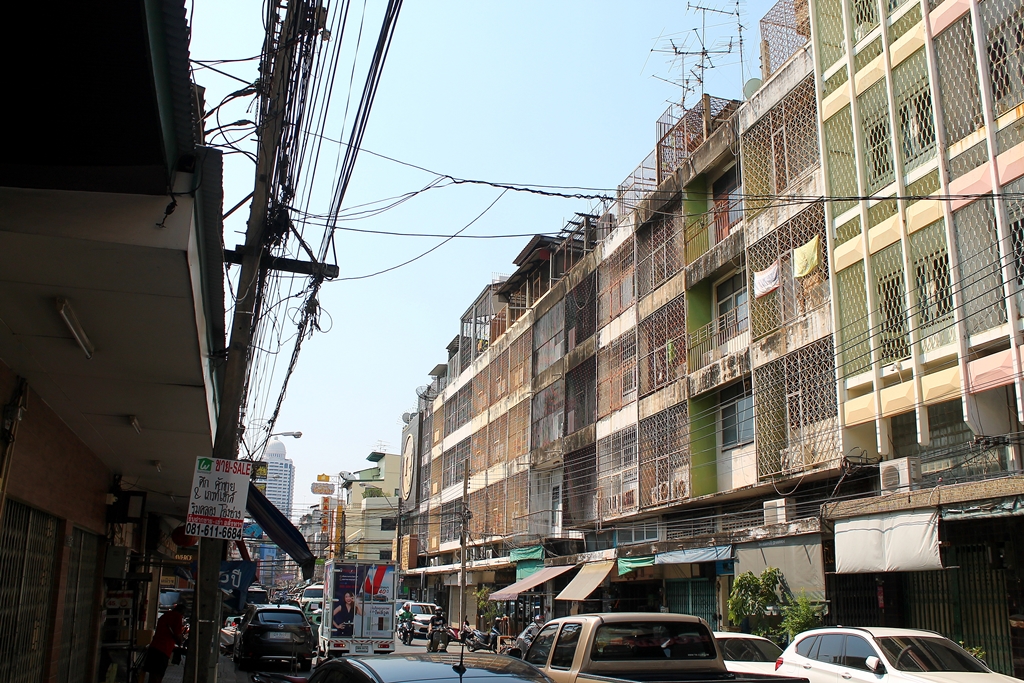 Wracam jednak do głównej ulicy kontynuując masz w kierunku centrum Chinatown. Z każdym krokiem podoba mi się tu coraz bardziej. To nie jest ten znany wszystkim Bangkok ze szklanymi wieżowcami, albo zabytkowymi świątyniami. Nad głową zaczynają się plątaniny kabli, elewacje są coraz brudniejsze, chodniki coraz bardziej zagracone i te przerażająco zakratowane okna i balkony. W przypadku ewentualnego pożaru raczej nie byłoby za ciekawie…